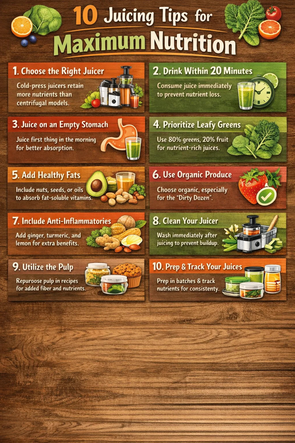 ジュースのレシピを季節の入手可能性に合わせて調整することは、経済的に賢いだけでなく、栄養的にも優れています。春と夏には、葉物野菜、キュウリ、ズッキーニ、トマト、ベリー、核果が豊富に収穫できます。秋と冬には、ビート、ニンジン、パースニップ、柑橘類、ザクロ、丈夫な根菜が収穫されます。それぞれの季節には独自の植物栄養素のプロファイルがあり、季節の農産物をローテーションすることで、自然に年間を通して微量栄養素の多様性が確保されます。