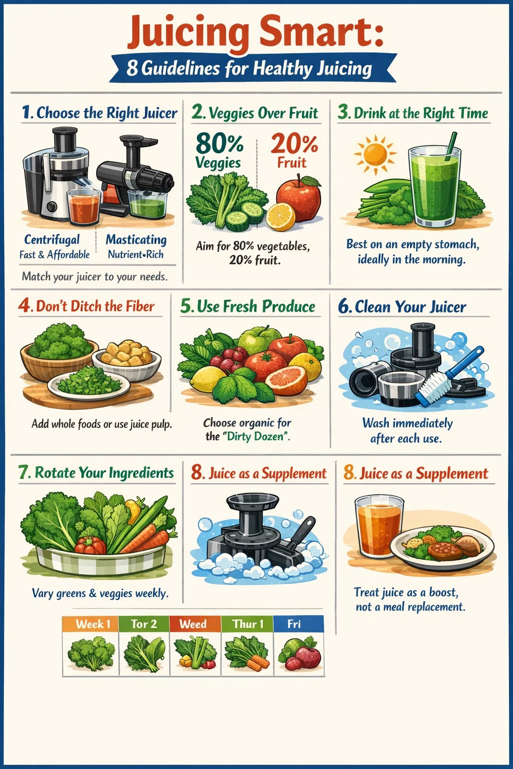 単純な答えが必要な場合は、ジュースは、自然食品を置き換えるよりも、バランスの取れた食事を補うときに最も効果的です。適切なジューサー、適切な材料、そしていくつかの賢い習慣が、真に健康的なルーチンと、静かに砂糖を摂取するルーチンとの間に違いを生み出します。以下の 8 つのガイドラインはノイズをカットし、実際に従うことができる実践的なフレームワークを提供します。