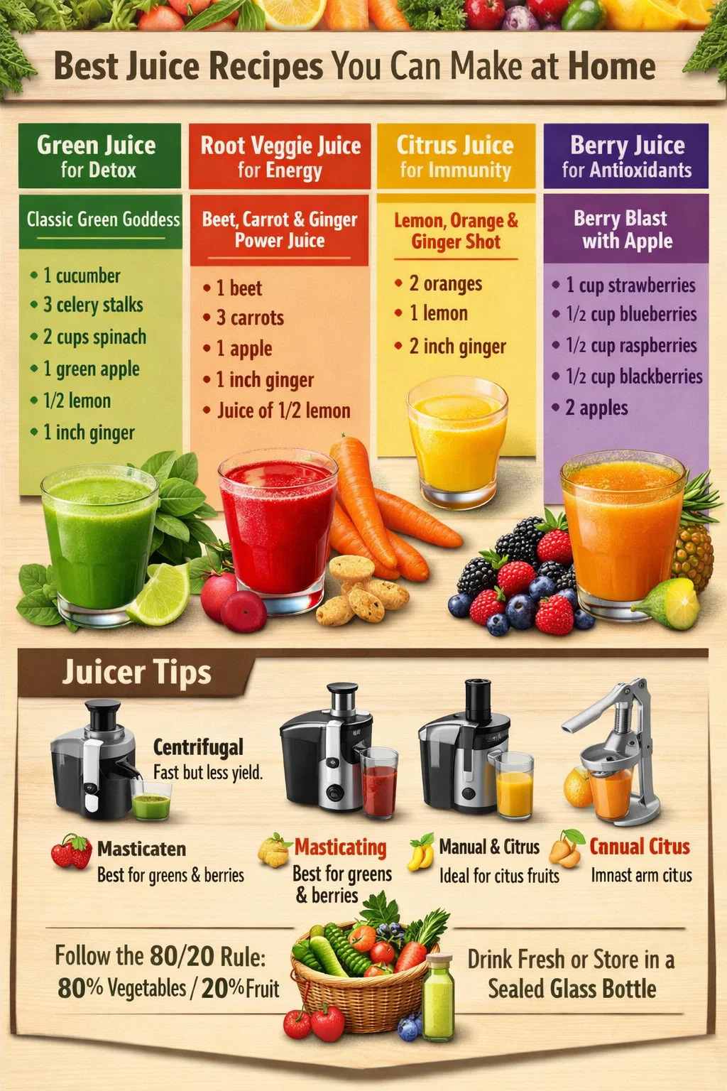 80/20 ルール — 野菜80%、果物20% — さまざまなジュースのレシピ間で栄養と美味しさのバランスをとるための最も実用的なフレームワークです。果物は甘みを加えてジュースを飲みやすくしますが、果糖も加えます。野菜は、はるかに少ない糖分で微量栄養素、クロロフィル、ミネラルを供給します。果物のみから作られたジュースは、市販のジュースと栄養面で劇的に違いはありません。家庭でジュースを作る本当の利点は、市販の製品には意味のあるレベルで含まれていることはほとんどない野菜が含まれていることです。