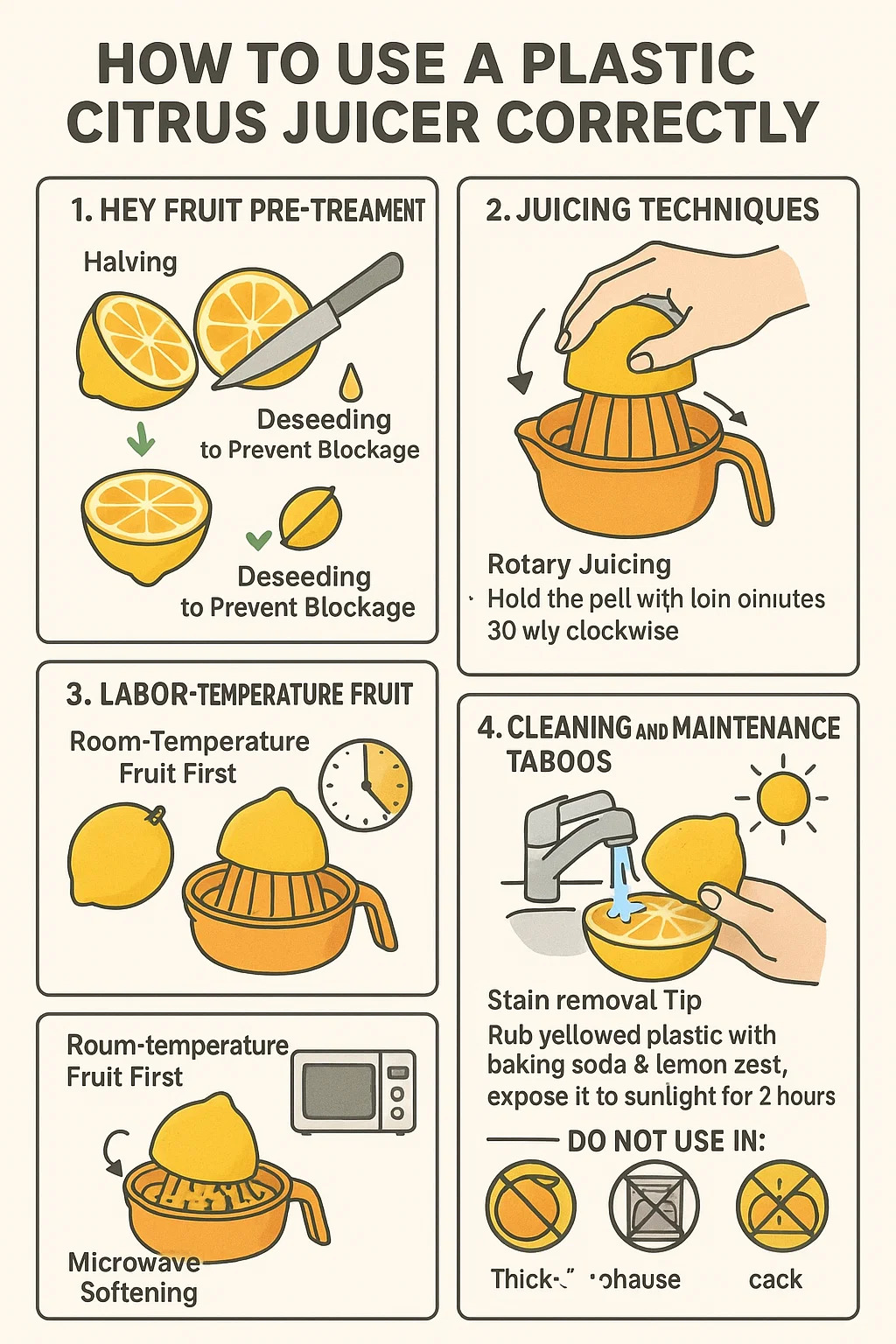 汚れを防ぐためにすぐに洗い流してください。絞った後はすぐに冷水で洗い流してください(熱湯はプラスチックへの果実油の浸透を促進し、プラスチックが黄色くなる原因となります)。