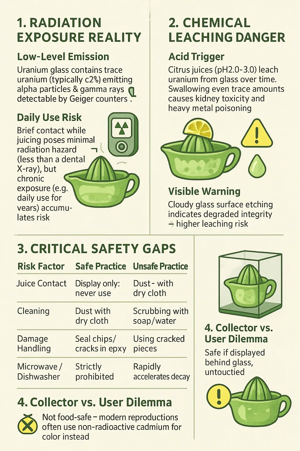酸のトリガー: 柑橘類のジュース (pH 2.0 ~ 3.0) は、時間の経過とともにガラスからウランを浸出させます。たとえ微量でも飲み込むと、腎臓毒性や重金属中毒を引き起こします。