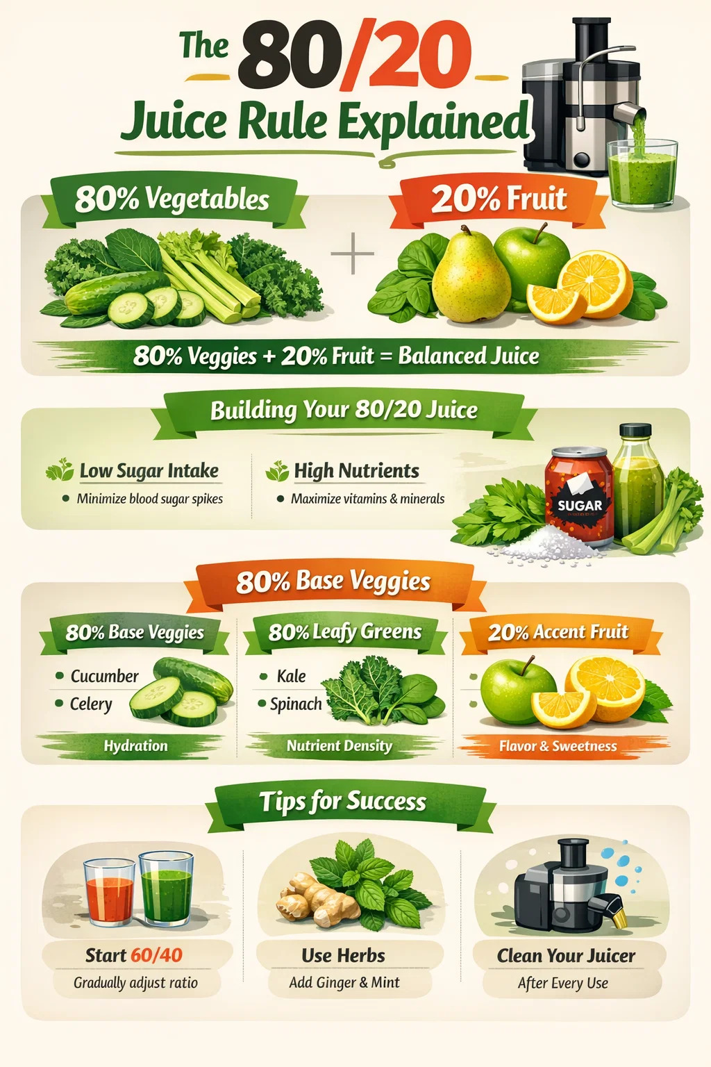 の ultimate goal of the 80/20 rule is to turn your daily juice into a 栄養豊富なサプリメント 甘いおやつではなく。を活用することで、 ジューサー 大量の野菜や水分の多い野菜を処理するには、大量のアルカリ性物質と抗酸化物質を体に供給する必要があります。このアプローチは、長期的な健康目標をサポートし、炎症の軽減を助け、フレッシュジュースが提供する真の薬効を確実に得ることができます。