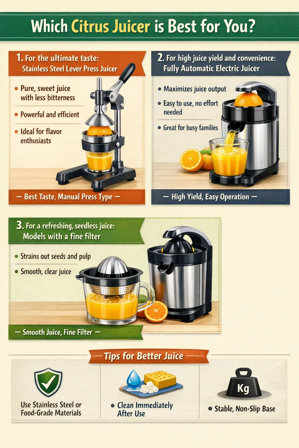 ⦁ 素材は非常に重要です: ステンレス鋼または食品グレードの素材を選択するようにしてください。柑橘系の果物は酸性が強いため、プラスチックの品質が悪いと時間が経つと不快な臭いが発生し、ジュース本来の鮮度が損なわれる可能性があります。